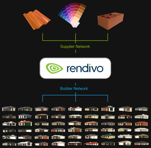 The Rendivo® service links Builders and Suppliers through a networked database. Building companies, and even individual homes, can be affiliated with Suppliers and their products to create real world market combinations.